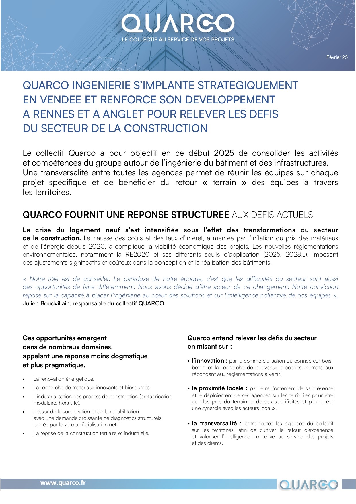 QUARCO INGENIERIE S’IMPLANTE STRATEGIQUEMENT EN VENDEE ET RENFORCE SON DEVELOPPEMENT A RENNES ET A ANGLET POUR RELEVER LES DEFIS DU SECTEUR DE LA CONSTRUCTION