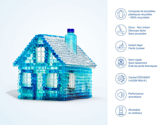 BREF, isolant éco-sourcé composé de bouteilles en plastique recyclées avec un Lambda de 0.034 certifié par l’ACERMI et un R=3.8 à 130mm, pour une protection contre le froid et la chaleur. Il est labélisé OEKO TEX, sans substances nocives.