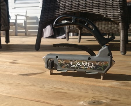 La solution de fixation discrète CAMO est constituée d'un gabarit de pose muni de canons de guidage des vis à 45° de chaque côté de la lame, de vis spécifiques en acier protégé PROTECH, inox A2 ou inox A4 et d'un embout de vissage lui aussi spécifique. Le gabarit dicte l'angle de vissage et la position précise des vis sur la tranche de la lame, et l'embout une fois en butée conduit la vis jusqu'à sa position idéale d'enfoncement. Avantage à la pose = rapidité et coût. Pour le client = esthétique, coût et retrait d'une lame possible.