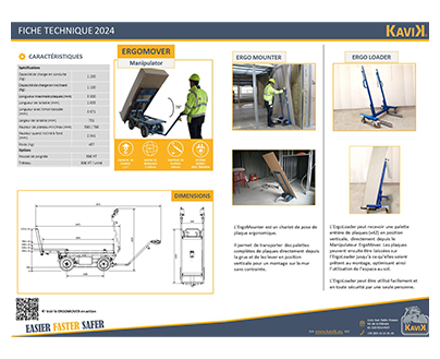 L'ERGOMOVER est un chariot à plaques automoteur unique qui, en plus de pouvoir descendre des piles de tréteaux de plaques de plâtre, peut également mettre des plaques de plâtre à la position verticale. Les planches jusqu’à 3000 mm peuvent être posées sur l’ ERGOLOADER, de sorte que l’ERGOMOVER est libre de ramasser une autre pile ou la pile peut être laissée sur l’ERGOMOVER et être montée individuellement sur le mur avec l’ERGOMOUNTER. L’ERGOMOVER MANIPULATOR, l’ ERGOLOADER et l’ERGOMOUNTER sont 3 unités uniques qui forment ensemble un système pour transporter efficacement des piles entières de plaques de plâtre jusqu’au camion sans pour autant nécessiter un levage manuel.