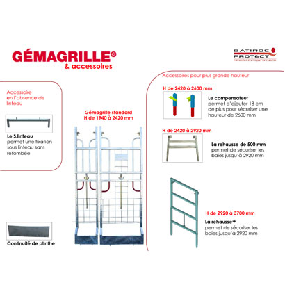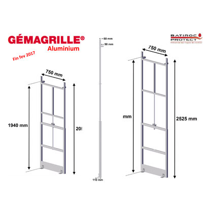 La Gémagrille® est déclinée en plusieurs hauteurs et largeurs, avec divers accessoires. La version en aluminium, presque 2 fois plus légère, est disponible fin février 2017.