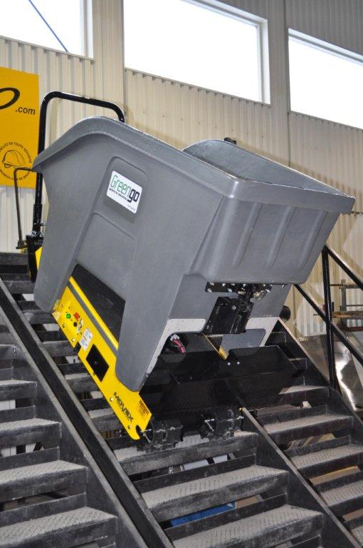 Ici, présenté en version « caisson », le GREENGO est un système de manutention novateur basé sur la technologie TRACK-O Lift tout terrain.